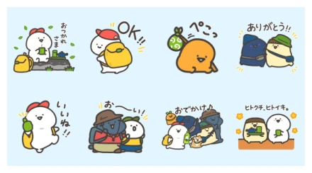 Starting from the top left, we have a white, chicken-like character taking a well-deserved break on a stone bench, sipping a cup of what is clearly Ayataka tea. With a yellow backpack by its side and the Japanese text for “Otsukaresama” (great work!), it’s the perfect sticker to send after a long day. Next to it, the same white character gives a comforting hug to a yellow friend, both looking content, with a big “OK!!” sign flashing beside them. Then we see an orange, blob-like character giving a polite bow (“Peko”), carrying a little traveler’s bundle—ideal for a quick, respectful greeting. The row finishes with two buddies, one in a blue hood and another in a green cap, smiling warmly with a huge “Arigatou!!” (Thank you!!) above them. It’s just pure, grateful energy.