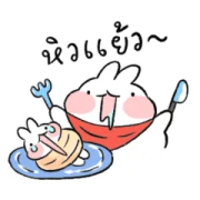 Now, let’s talk about the essentials: food and feelings! You’ll find our little pal looking a bit out of sorts, feeling ‘Without strength~’. But fear not, hunger strikes, and it’s time for the star of the show: our character enthusiastically slurping noodles in a cute red bib, announcing ‘Hungry now~’ – this is totally where that ‘Nom nom’ caption comes in! And after a good meal, well, sometimes you just gotta let out a little ‘Burp~’. To top it off, there’s a festive bunny in a grass skirt, looking super cheerful and ready to cheer you on with a ‘Go go! / Fight on!’ spirit.