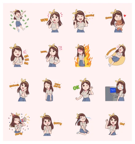 This pack is packed with relatable moments. From the first row, VIRA joyfully makes it rain money, then expresses wide-eyed “WOW” surprise, cheers “MANTAP!“, and adorably hugs a teddy bear (“EMES“). The next row shows her bursting with “HA HA HA” laughter, then deep in thought with “hmmm…??“, followed by absolutely fuming in flames! Luckily, she quickly chills out, lounging on a beanbag chair with an “ASYIKKK!” vibe.