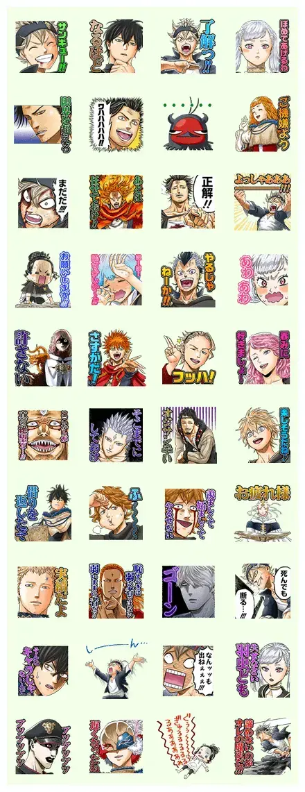 Even the more serious figures join the fun. You will find the terrifying Vetto, the calm Patry, and the eccentric Jack the Ripper. The Wizard King Julius Novachrono offers a regal well done, while Fuegoleon and Nozel show off their stoic determination. The set wraps up with some hilarious reaction shots, like Asta screaming in terror or Charmy running away in a total panic. It is a complete emotional rollercoaster that makes every conversation feel like an episode of the show.