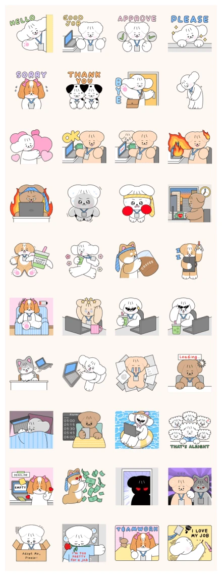 Get ready for all the office feels! This set covers everything from warm greetings like Bumbi’s cheerful “HELLO” and polite requests such as her sparkling “PLEASE” to expressions of gratitude with a sweet “THANK YOU.” You’ll find encouraging sentiments like “GOOD JOB,” clear approvals, and even humble apologies. The collection also perfectly captures the daily grind: from dogs coolly giving an “OK” with coffee in hand to those utterly overwhelmed by numbers or literally ablaze with deadline stress. You’ll see determined chef-hatted pups, ready for action, and even a peaceful coffee break moment gazing at the city. It’s truly a full spectrum of workday emotions!