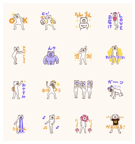 The top row is all about positive vibes. You’ve got the bear striking a confident pose with a giant “OK,” followed by a double-thumbs-up that just screams “I’m awesome!” Then there’s a smug-looking bear with his arms crossed, surrounded by sparkles and the text “Uun uun” (a sound for nodding or agreeing). To cap it off, he’s wearing a little party hat, holding a giant heart that says “LOVE” and “Otodoke,” which means “delivery.” It’s perfect for sending some love to a friend. The second row covers your daily work life, from a polite bow with “Otsukaresama desu” (a common greeting for a colleague) to a buffed-up, confused bear asking “N?” (Hmm?). He then shows overwhelming gratitude (“Kansha”) before zoning out completely in a yellow bubble.