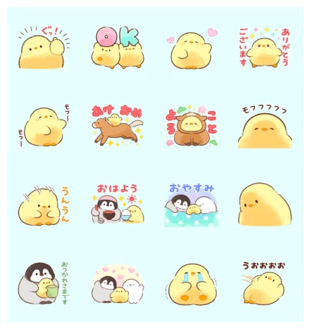 Finally, the fourth row rounds out the collection with more relatable moments. We see the penguin and chick enjoying some tea together, a perfect way to say “You’ve worked hard.” There’s also a heartwarming scene with the penguin, a chick, and an even tinier chick, surrounded by hearts, symbolizing family and affection. Not every moment is happy, though; one sticker shows a chick shedding big tears, perfectly conveying sadness. And to wrap it up, a chick looks utterly surprised or startled, with a sound effect to match, adding a touch of playful drama to your chats.