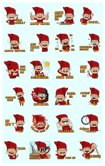 Let’s dive into the sticker set itself! This character, with his signature red Passapu (a traditional Makassar hat) and impressive mustache, is basically a whole mood. The stickers capture daily life and expressions from Makassar with such perfect, funny details.