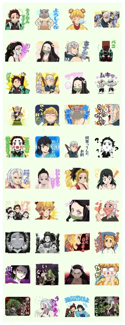 Looking at the first few rows, we see Tanjiro looking super polite, followed by Inosuke flexing his muscles with a friendly greeting. Then there is Zenitsu in his hilarious undercover disguise, snot bubble and all! Of course, Tengen Uzui steals the show with his flamboyant poses and confident smirk. My personal favorite has to be the row featuring those buff muscle mice flexing their tiny but mighty arms. They are absolutely ripped and ready to help you win any argument in your chat group.