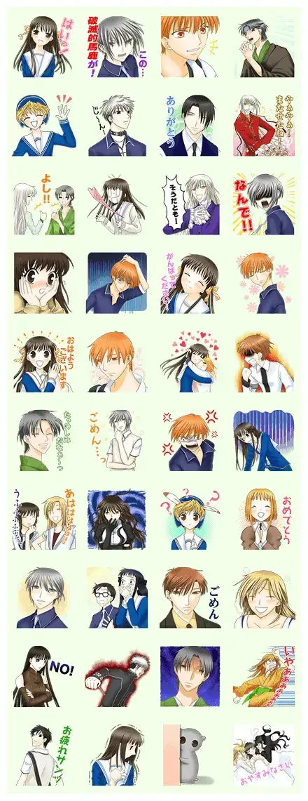 Moving down, you will find some hilarious reactions. There is a sticker of Ayame being his usual dramatic self, and another of Yuki looking absolutely baffled by his brother’s antics. The middle rows feature some sweeter moments, like Tohru giving a big cheer or Kyo looking surprisingly peaceful while resting. These are perfect for when you want to send a bit of warmth to a friend.
