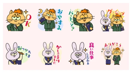 Following that, the rabbit beams with pride, hand on chest, surrounded by sparkling stars, declaring “I did a good job” (良い仕事したわあ). We love a self-confident character! Finally, to round out the set, both the rabbit and the cat appear together, with the rabbit looking appreciative and the cat holding a book, all while “Thank you” (ありがとう) shines brightly. These stickers truly capture a whole range of emotions, from focused work to heartfelt gratitude, making your LINE and WhatsApp chats much more expressive!