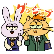 Moving along, our cat friend looks utterly confused, hand over his chest, with a big “Pardon?” (パードゥン?) bubble. We’ve all been there, right? And to cap off the first row, both the cat and the rabbit are giving a cheerful thumbs-up, looking super pleased, with “Good Job” (グーッジョブ) splashed nearby. Talk about a great way to celebrate a win!