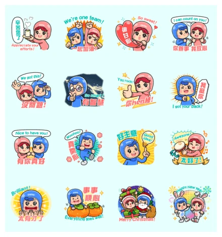 Get ready to infuse your messages with a burst of cheerful energy, all thanks to the “An An Baby” sticker set! This collection is just packed with super cute characters, both the pink and blue An An Baby, ready to make your chats sparkle. Let’s take a closer look at the first row, where appreciation and teamwork really shine through. First up, we’ve got the pink An An Baby holding a glowing candle, looking so grateful with the message “Appreciate your efforts!” It is the perfect way to say thank you to someone who has gone the extra mile. Right next to that, the blue and pink duo are giving each other an enthusiastic fist-bump, declaring “We’re one team!” – ideal for celebrating collaborative victories. Then, the pink An An Baby sweetly clutches a heart, radiating “So sweet!” – a fantastic sticker for those heartwarming moments. And to round out this row of goodness, the blue and pink characters share a comforting hug, assuring you “I can count on you!” Talk about supportive pals!