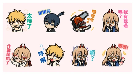 Next to Denji, there’s Aki Hayakawa, looking all sophisticated and slightly serious, giving a polite “謝謝你” (Xièxiè nǐ), which, of course, means “Thank you.” It’s so Aki to be calm and collected, even in sticker form! Then things get gloriously wild with Chainsaw Man himself, laughing maniacally with a hearty “哈哈哈哈” as he revs up his iconic chainsaw head and arms, ready to slice and dice through any dull conversation. You can practically hear the motor!