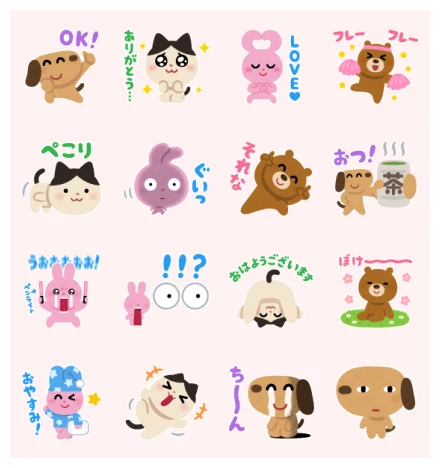 The second row kicks off with the same cute cat, but this time it’s bowing politely, accompanied by “ぺこり” (Pekori, an onomatopoeia for bowing or a polite apology). Next, a quirky purple creature looks a bit confused or surprised, with “ぐいっ” (Gui-t, perhaps a sound of stretching or a gentle pull). Our brown bear is back, looking a bit flustered or shocked, exclaiming “えーそれな” (E~ sorenah, which means “Oh, totally!” or “You’re telling me!”). And finishing this row is the happy brown dog again, holding out a steaming cup of tea with “おつ!” (Otsu!, short for “Otsukaresama,” meaning “Good job!” or “Thank you for your hard work”) and the character “茶” (cha, tea) on the cup. So relatable, especially during a busy day!
