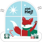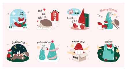 The sticker set itself is a pure burst of holiday cheer, with eight unique designs to brighten up any conversation. In the first row, we kick off with a cute fox peeking out a window, surrounded by gifts and saying “Hej!” – a friendly Swedish greeting. Next, a sweet hedgehog sits in the snow near a quintessential red house, with Thai text that reminds us “Christmas is almost here.” Then, a sleepy gnome dreams of gifts, murmuring “ZZZ,” clearly ready for a nap after all the festive prep. The row concludes with our fox, owl, and hedgehog busily decorating a Christmas tree, wishing everyone a “Merry X’mas.”