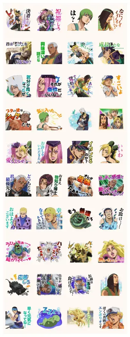 This sticker pack is a total treat for JoJo fans, capturing all that chaotic energy from the second half of Stone Ocean. It is packed with iconic faces like Jolyne looking fierce and Father Pucci being his usual intense self. You even get the legendary DIO’s sons in the mix, like Ungalo looking bizarre and Rikiel feeling the heat! The art style stays perfectly true to the anime, which is awesome. I love the one where Jotaro looks proud of Jolyne’s growth—it is such a vibe. Whether you are sending a dramatic Weather Report pose or a crying Emporio, these stickers bring so much personality to your chats. Honestly, seeing Narciso Anasui looking so serious makes me laugh every time. If you want your messages to have that flamboyant JoJo flair, this set is a must-have for your daily conversations!