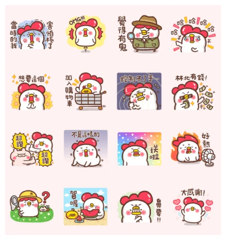 The third row shows bibi popcorn getting a “super awesome” stamp of approval from a pig—great for high-fives! Then, our chicken looks stern, pointing a finger to declare, “I’m not kidding!” Next, a sparkly background highlights bibi popcorn happily holding a package, announcing “Delivered!” And for unbearable moments, we get bibi popcorn literally on fire, fanning itself furiously and shouting “So hot!”