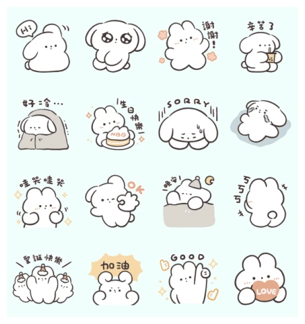 Last but certainly not least, the fourth row brings us some heartwarming moments! We kick it off with a festive group of bunnies, all decked out in party hats, wishing everyone “Merry Christmas!” (聖誕快樂) – so festive and sweet! Following that, our bunny friend offers a powerful “Go for it!” or “Cheer up!” (加油) with an encouraging pose, just what you need to boost someone’s spirits. Then, another firm “GOOD” sticker with a thumbs-up and sparkles, perfect for celebrating success or giving a positive affirmation. And to tie it all up with a bow, the final sticker features our bunny holding a lovely “LOVE” heart, radiating pure affection and sweetness. What a perfect way to express your feelings!