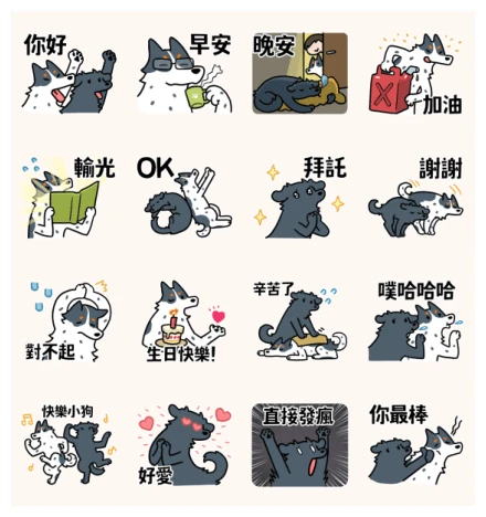 For the grand finale! Two dogs bopping to music (“快樂小狗” – Happy Little Dog). The dark grey dog is smitten, surrounded by hearts, exclaiming “好愛” (So Much Love). It then throws its paws up in exasperation with “直接發瘋” (Going Crazy). Last, it gives a proud pat with “你最棒” (You’re The Best), a fantastic cheer!