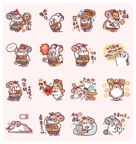 First up, we’ve got a little detective mouse holding a magnifying glass with a plus sign, ready to say 感謝 (thanks) with heartfelt appreciation. Next, our little friend looks utterly bewildered, dropping a big 啥? (huh?) – perfect for those “wait, what just happened?” moments. Then, there’s the excited mouse surrounded by a treasure chest, gleefully exclaiming 發財啦! (get rich!)—a fantastic way to celebrate good fortune. Rounding out the first row, our smart mouse detective is deep in thought, declaring 智商 在線 (my brain is working), making it ideal for when you’re feeling particularly sharp or solving a puzzle!