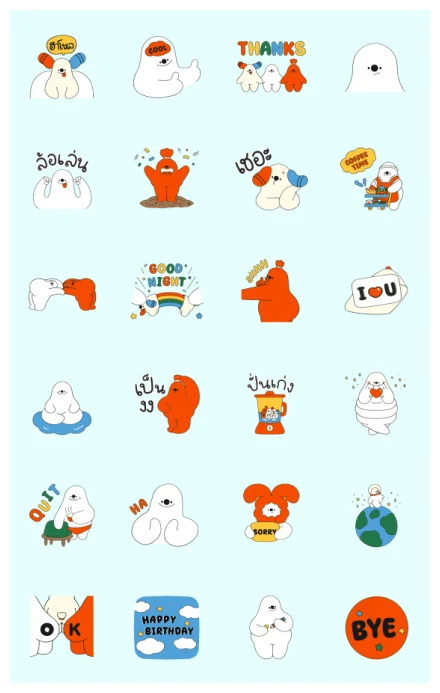 This sticker pack is a treasure trove of expressions! In the first row, we kick things off with Mr. Happiness looking super upbeat, holding some colorful shakers and saying “Hello” in Thai. Next, he’s giving a cool thumbs-up with a “COOL” thought bubble. Then, a trio of white, blue, and orange buddies cutely thanks you. The last one is just a simple, white character with a tiny mouth, looking a little bit blank or pensive – we all have those moments!
