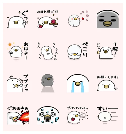 The first sticker shows our white chicken giving a cool thumbs-up with a smirk, feeling pretty pleased with itself, accompanied by a little “ぐっ” sound. Next, it’s bowing slightly while holding a tray with watermelon and a drink, saying “お疲れ様です!” – a polite way to say “good job” or “thanks for your hard work!” Then, things get cute as our chicken blushes, surrounded by pink hearts, looking all shy or totally smitten. The final one in this row is a close-up of a grey chicken’s face, giving a super serious, unimpressed look with just its eyes and beak visible.