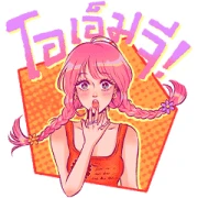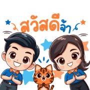 The bottom row brings even more personality. The first sticker shows P’Sri laughing his head off, complete with the numbers “555,” which is the Thai equivalent of “LOL.” It’s bursting with joy. Then you see him and the cat giving a confident “OK” sign, with text that probably means “Okay, let’s do it!”—great for making plans. The next one is my personal favorite: P’Sri and N’Tunjai, who is now sporting cool sunglasses, are surrounded by the Thai word for “Rich” repeated three times. It’s a fun way to wish someone good fortune! Finally, the set closes with a burst of motivation. The female character wears an orange “FIGHTING!” headband and cheers with pom-poms, encouraging you to “Keep going!” It’s the perfect sticker to send to a friend who needs a little boost.