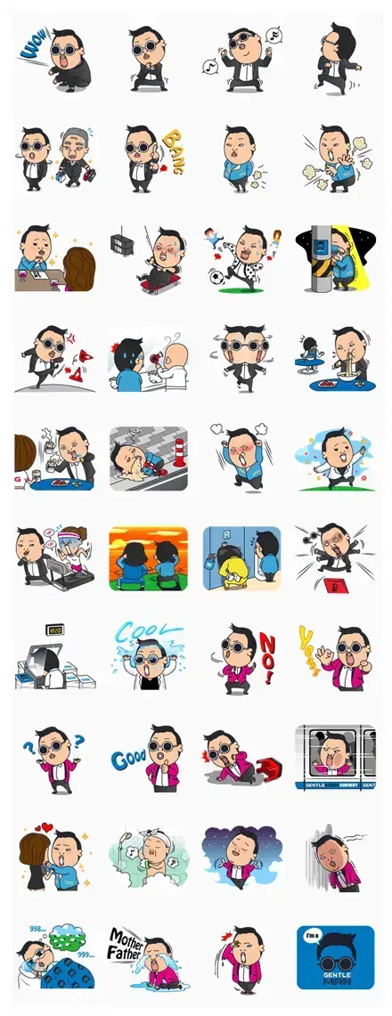 These stickers capture PSY’s signature style, dance moves, and expressions, reflecting the energy and fun of the “Gangnam Style” phenomenon.