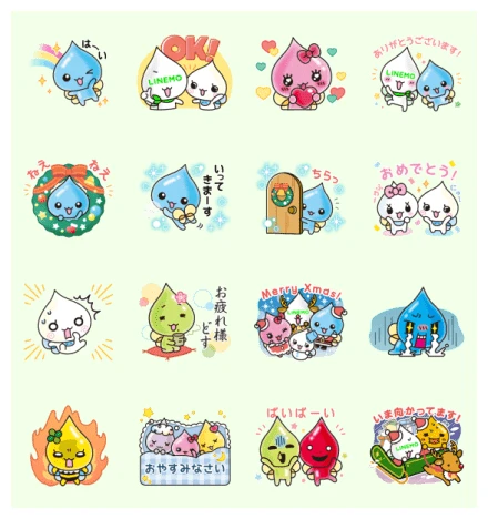 Wrapping things up, the last row features some seriously vibrant expressions. We’ve got a yellow-orange Shizuku-chan engulfed in flames, looking incredibly fired up or super angry. Talk about passion! Next, three adorable Shizuku-chan characters (pink, white, and yellow) are snuggled cozy in bed under a blanket, with “おやすみなさい” (Good night). Such a sweet way to end the day. Then, a lively green Shizuku-chan and a bold red Shizuku-chan are waving enthusiastically, shouting “ばいばーい” (Bye-bye!). This is your perfect farewell sticker. Last but not least, a fun group of Shizuku-chan friends, including a reindeer Shizuku-chan, are cruising on a green sleigh with the LINEMO logo, exclaiming “いま向かってます!” (I’m on my way!). It’s dynamic and perfect for telling someone you’re en route!