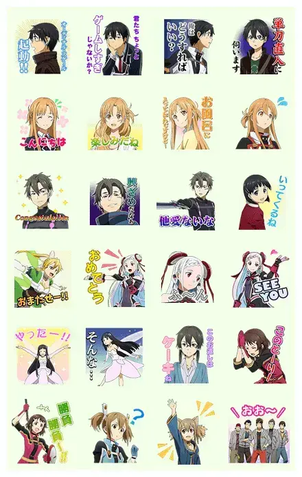 This sticker pack is packed with familiar faces, giving you a piece of the action from the Sword Art Online feature film. You’ll find Kirito, looking cool as ever, ready to jump into action or maybe just wondering if he’s been gaming a little too much (been there, Kirito!). Then there’s Asuna, flashing her famous smile or perhaps looking a bit surprised, fresh out of a virtual bath, no doubt.