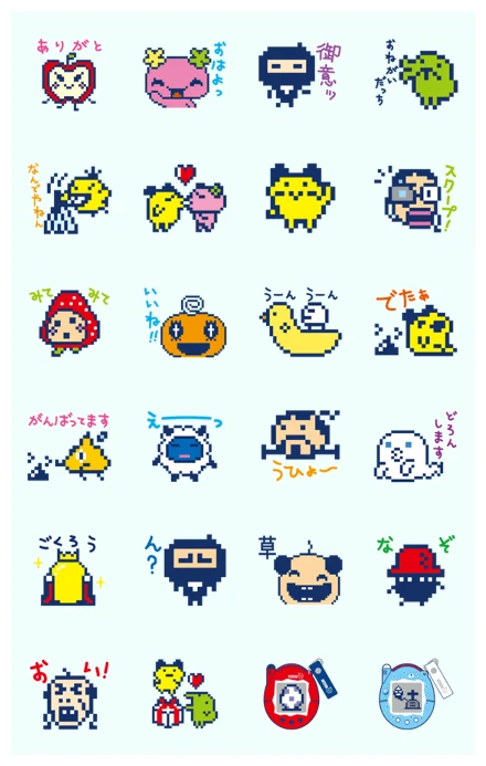 The lineup starts strong with some really expressive characters. There’s a cheerful apple-like creature offering a sweet “ありがとう” (Arigatou – Thank you), and a happy pink floral character greeting you with “おはよう” (Ohayou – Good morning). You’ve also got a cool little ninja who solemnly says “御意なり” (Gyo-i nari – As you wish), which is perfect for when you agree to a plan. Right next to him, a frazzled green blob creature is vibrating with stress—we’ve all been there! The second row keeps the energy going with a spunky yellow bird character shouting “なんでやねん” (Nande ya nen – a playful “Why?!” or “What the heck?!”), a pair of Tamagotchis sharing a sweet kiss under a heart, and a very happy-looking Mametchi just waving hello. There’s even a guy with glasses snapping a photo and yelling “スクープ!” (Sukuupu! – Scoop!), for when you’ve got the latest gossip.