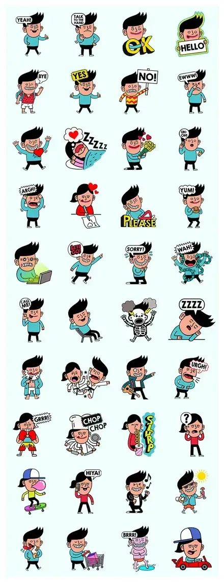 The first row kicks off with a super enthusiastic “YEAH!” guy giving a thumbs up, then a dismissive “TALK TO THE HAND” gesture. Next, there’s a big, bold “OK” showing confidence, followed by a friendly “HELLO” from a smiling character.