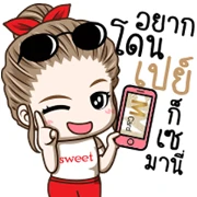 The third row brings even more delightful expressions. Our fashionista is surrounded by shopping bags and a “SALE” tag, looking excited, perhaps saying “Time to grab some deals!” She then gives a cheerful wink and an “OK” sign, showing her approval or agreement. Next, she’s bursting with laughter, surrounded by “5”s (a Thai way to express “hahaha”), clearly having a fantastic time. And, of course, no shopping spree is complete without a polite and appreciative “THANK YOU,” with her hands clasped in a gesture of gratitude.