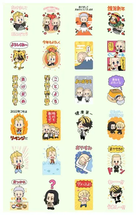 These “Tokyo Revengers New Year’s Big Stickers” aren’t just cute images; they’re a fun way for fans to connect with their favorite anime characters during a special time of year. Whether you’re sending a casual greeting or expressing a specific emotion, these stickers let you do it with the familiar faces of Tokyo Revengers. It’s a neat blend of seasonal tradition and pop culture enthusiasm.