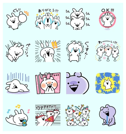 The last row starts with Usagyuuun chilling out, lying on his back, eyes closed in bliss as he holds a smartphone, presumably listening to music given the musical notes floating around him. Pure relaxation! After that, we see a dynamic duo of Usagyuuun cheerleaders, one in a red headband holding a megaphone, both excitedly shouting “ワァァァァァァ!!!” (Waaah!!!) with their hands raised. They’re hyping something up big time! Then it’s a full-blown Usagyuuun party scene, with multiple bunnies in party hats, confetti flying, and everyone looking super happy and celebratory. This is definitely for those “Let’s party!” moments. And to wrap up the collection, we see our purple, blob-like friend from earlier, now shedding a big, cartoonish tear from his eye, looking a bit sad or overwhelmed, with a dramatic drop of liquid coming from his mouth. A truly emotional exit!