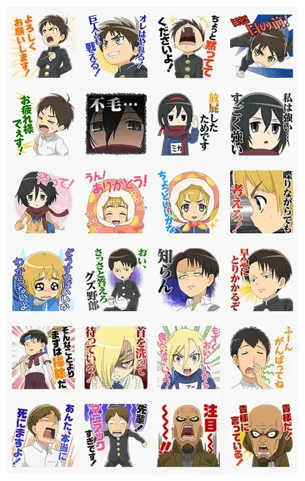Bust out laughing with talking stickers from this official Attack on Titan spin-off comedy! Eren, Mikasa, Armin, and Levi deliver their famous lines to enliven your chats big time!