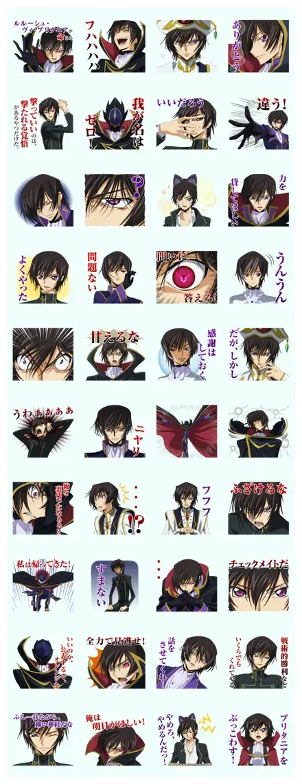 This sticker pack is a treasure trove of Lelouch’s iconic expressions and unforgettable lines. You get to see every side of him, from his sinister smirks to his moments of pure rage, making your conversations so much more expressive. It’s like having a little piece of the Code Geass drama right in your pocket!