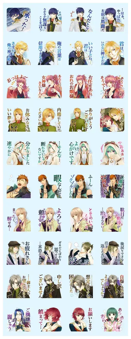 The ninth row features a man in a dark suit who looks quite serious, even bowing deeply to show his apologies. Finally, the last row gives us a variety of characters, from a blue-haired man with glasses looking very regal to a red-haired girl looking determined. There is a sticker for every possible mood you might encounter in a group chat.