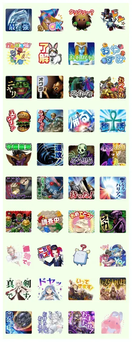 This sticker set from the Yu-Gi-Oh! Official Card Game Vol. 2 captures a wide range of emotions and expressions using popular characters and monsters from the series. Each sticker provides a fun and engaging way to spice up chats, aligning with the spirit of the Yu-Gi-Oh! anime and card game series. The detailed and vibrant illustrations paired with common Japanese expressions make them versatile for various conversational contexts.